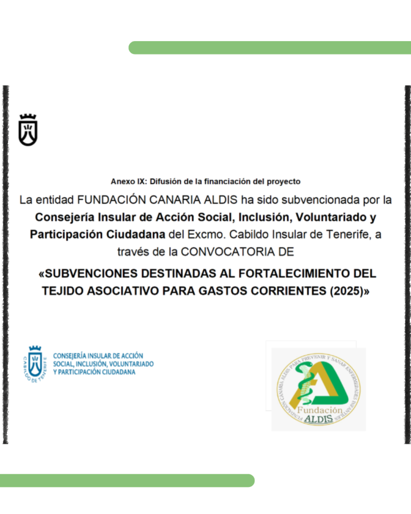 Desde Aldis, queremos compartir que somos beneficiarios de la convocatoria de «Subvenciones destinadas al fortalecimiento del tejido asociativo para gastos corrientes (2025)», impulsada por la Consejería Insular de Acción Social, Inclusión, Voluntariado y Participación Ciudadana del Cabildo Insular de Tenerife.