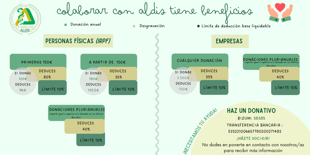 Donar a Aldis tiene beneficios fiscales que se pueden reflejar en el Impuesto de Sociedades (IS), en el caso de las empresas, o una deducción sobre el Impuesto sobre la Renta de las Personas Físicas (IRPF). La donación que puedas aportar, ayudará a nuestra entidad a seguir con nuestra labor en mayor medida a lo largo del tiempo, además de verte beneficiado por esta gran causa.